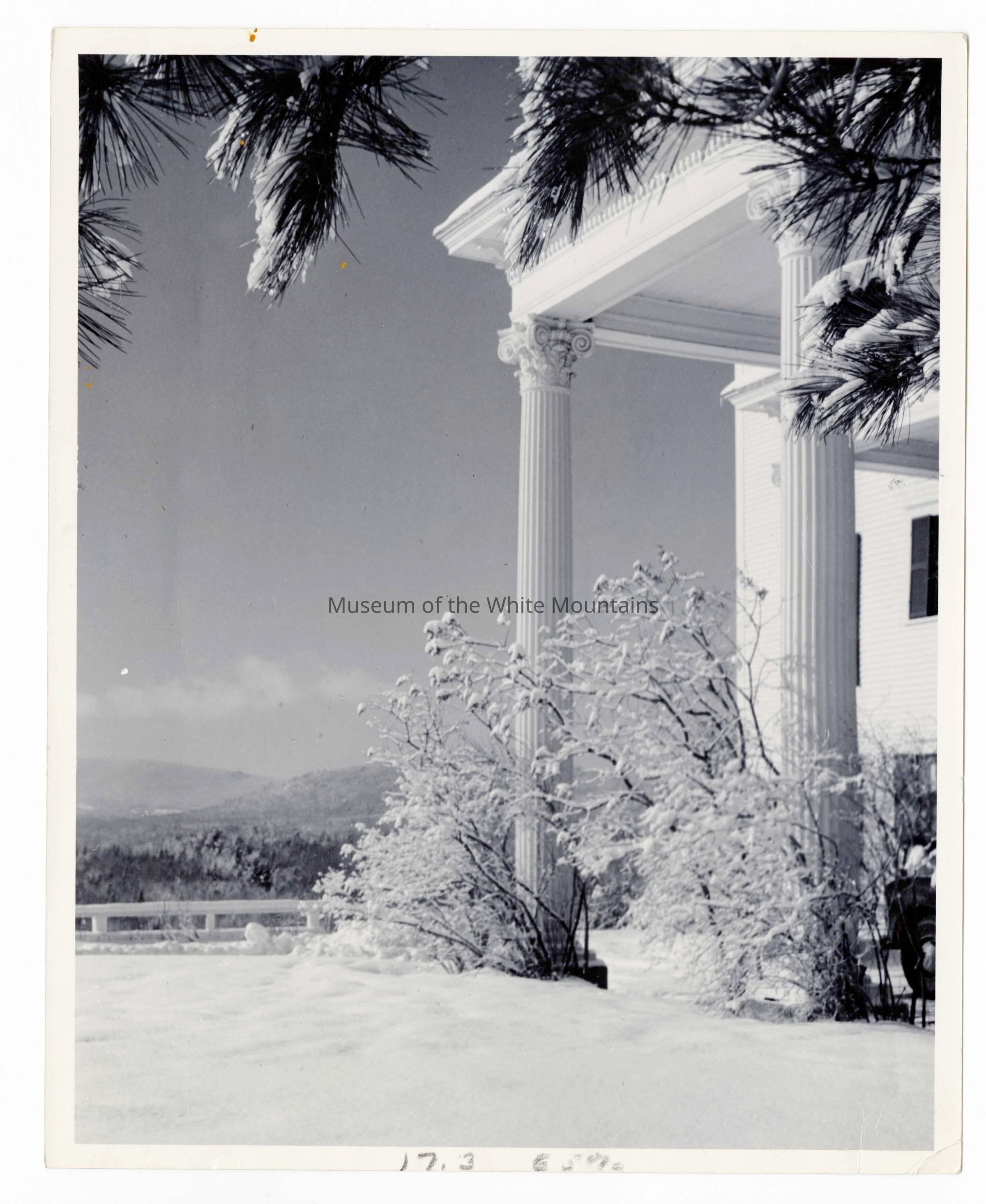 View of hotel front pillars in the winter. Snow on ground and trees around.