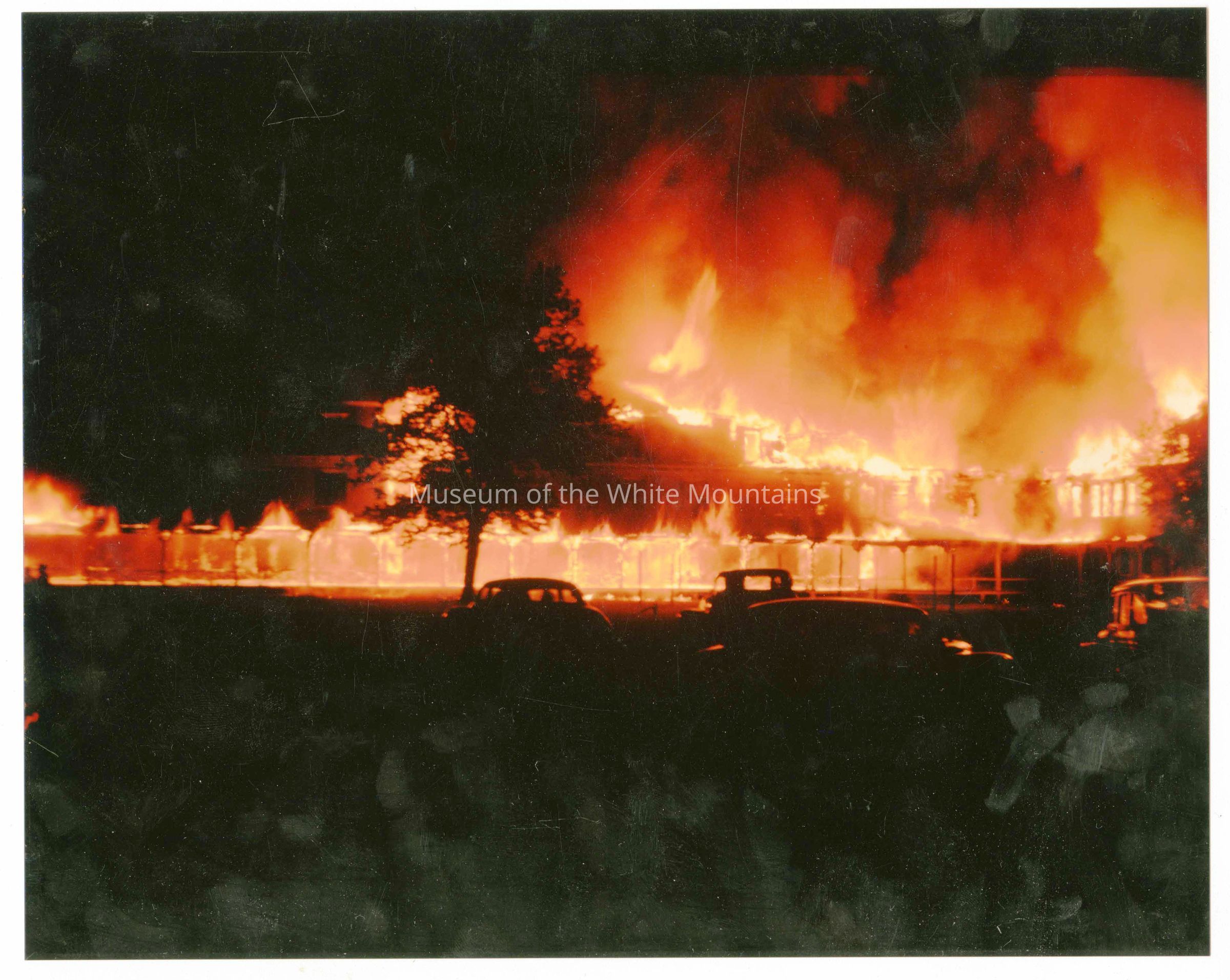 View of the Deer Park Hotel completely on fire. Cars outside of fenced area parked.
