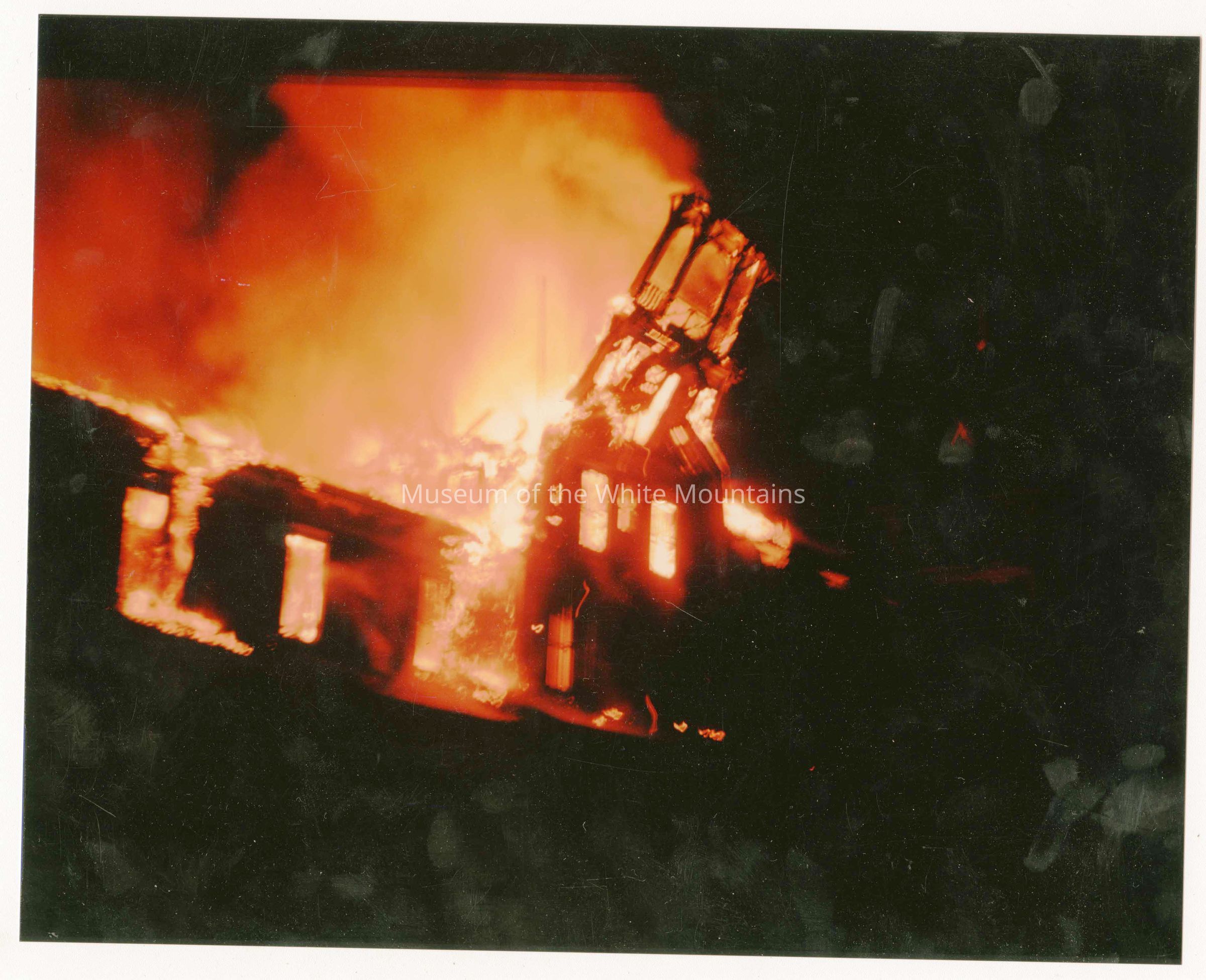 View of the Deer Park Hotel completely on fire. Tower part of brulding falling forward in flames.