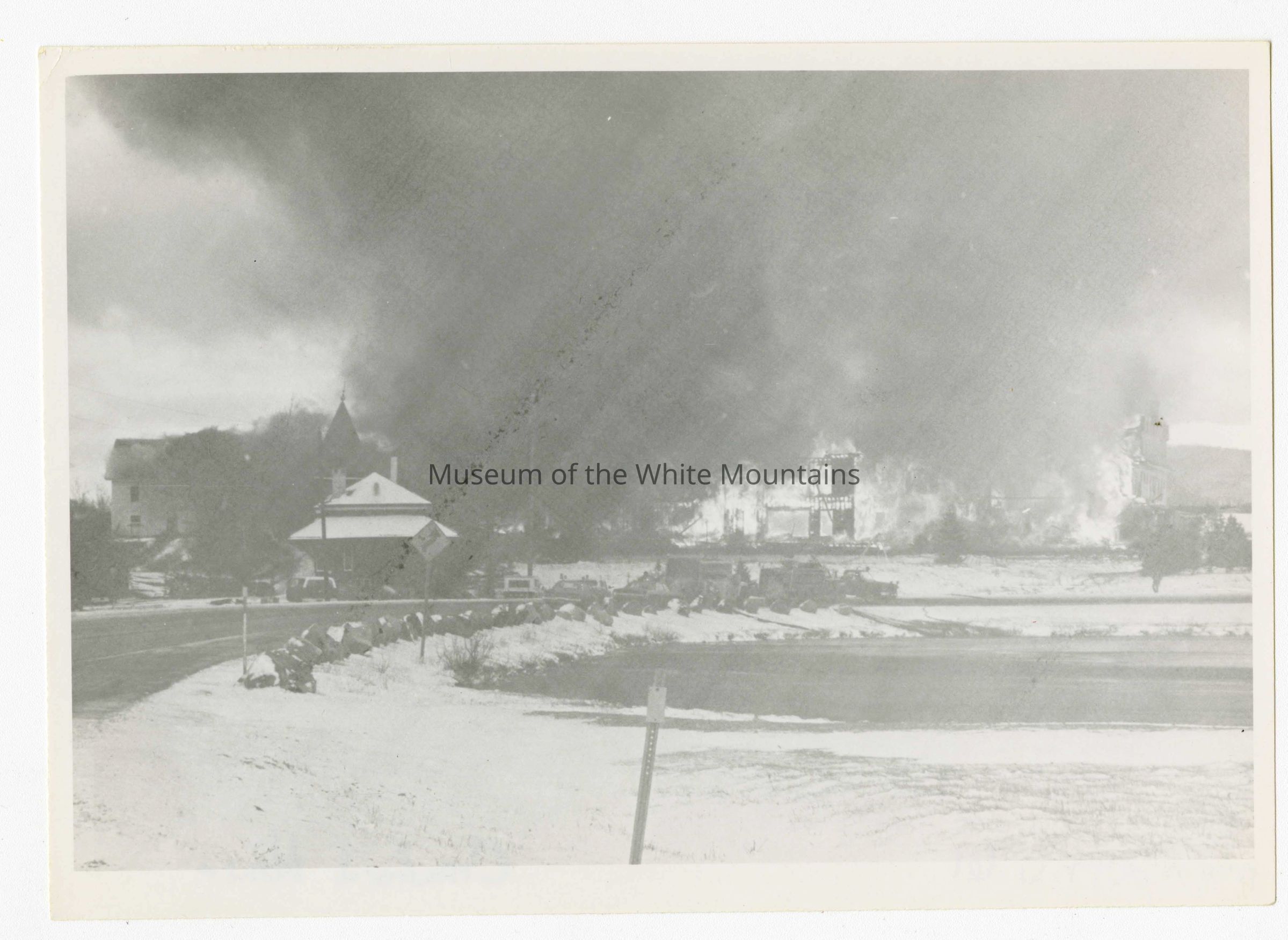 View of Crawford House on fire. Image taken from street including pond and street signs. Cars parked at front of bruilding.