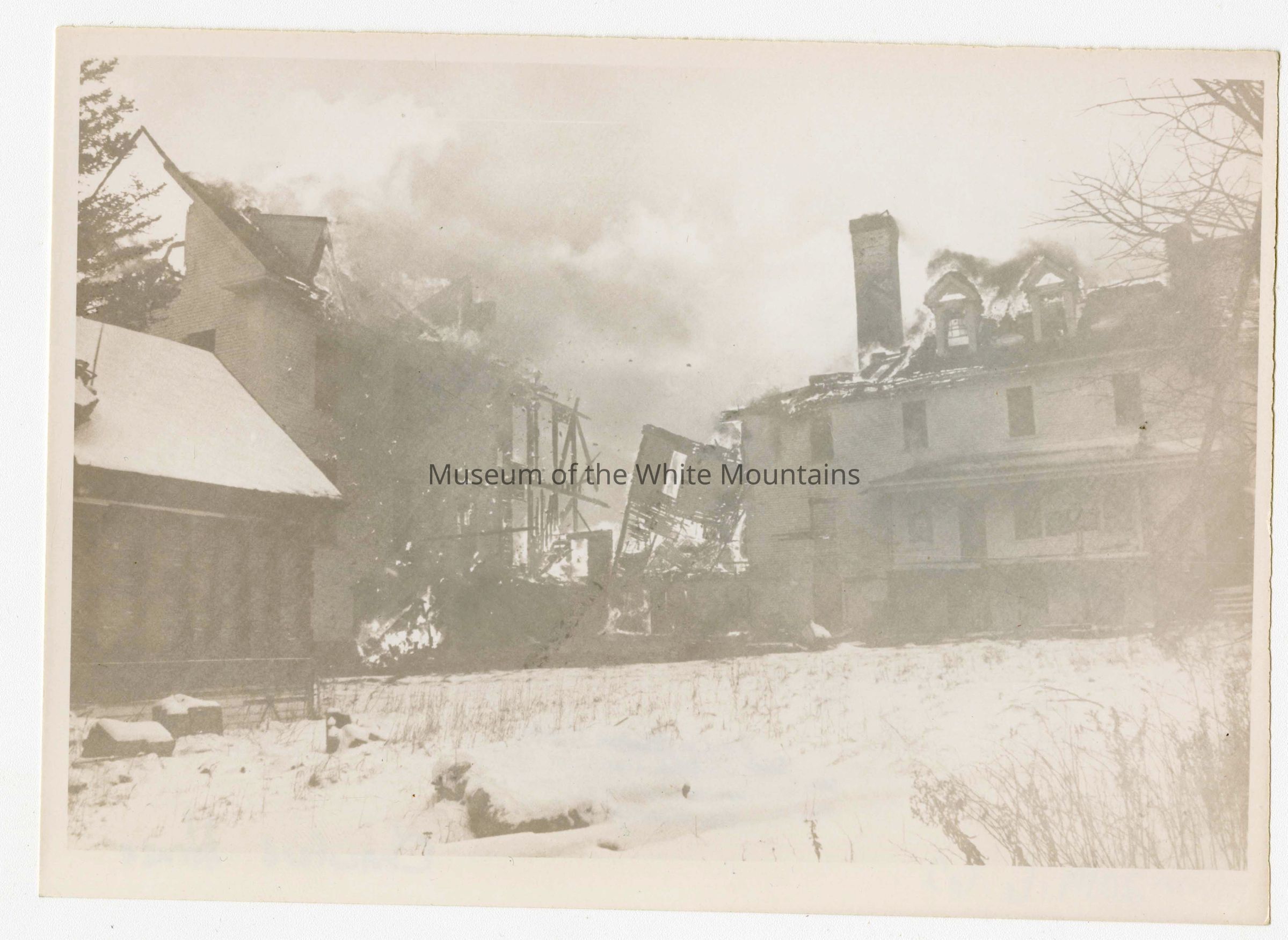 View of Crawford House on fire. Image of partial building collasing. There is snow on the ground.