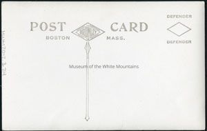 Item is a sepia-toned image of skiers making their way down a powery snowy mountain. There are trees among the ski trail. Back is divided.