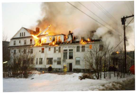 View of the Bartlett House burning. The hotel was originally known as The Cave Mountain House; it burned in 1905 and was rebuilt as The Howard Hotel. The hotel was eventually renamed the Bartlett Hotel. It operated until 1989 when it was destroyed by fire caused by thawing pipes