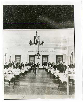 Interior view of the interior of the Glen House dining room, with waiters standing at the tables.