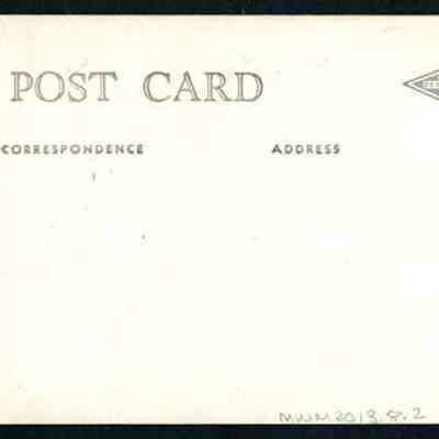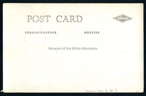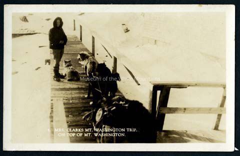 Item is a postcard featuring a black and white image of a woman and a team of sled dogs on a wooden walkway in a snowy area. They are at the top of Mount Washington on April 3, 1932. Caption reads, '4 Mrs. Clarks Mt. Washington Trip. On Top of Mt. Washington.'