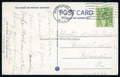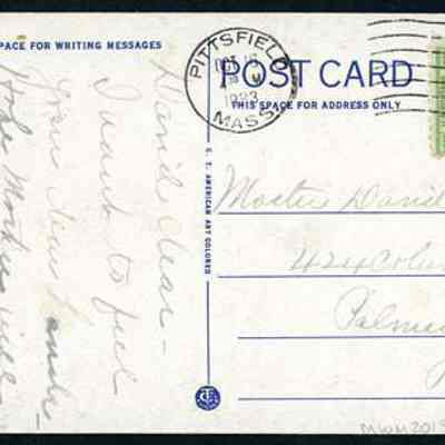 Back Description: Divided back with handwritten note and address with postmark and postage stamp.