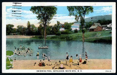 Item is a postcard featuring a colorized image of people on a sandy beach, in the water, on a raft, and on a canoe. In the background is a grassy hill, trees, and buildings including houses and a barn. Caption reads, 'Swimming Pool, Bethlehem, White Mts., NH.'