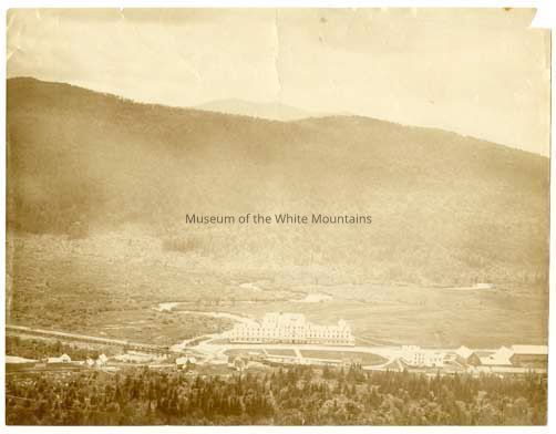 View looking down towards the Fabyan House. Includes the hotel, outbuildings, and railroad.