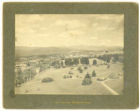 View of the lawns, gardens, and buildings surrounding the east side of the Maplewood Hotel.