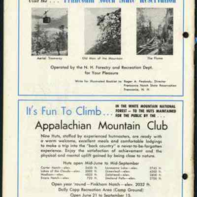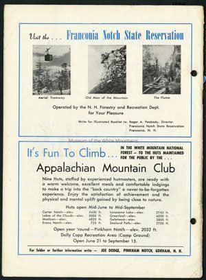 Appalachian Mountain Club, Bartlett (Carroll county, New Hampshire : inhabited place), Cannon Mountain (Grafton county, New Hampshire : peak), Cannon Mountain Aerial Tramway, Chase Barn Playhouse (Coos county, New Hampshire : inhabited place), Cherry Mountain (Coos county, New Hampshire : peak), Connecticut Lake (Coos county, New Hampshire : lake), Cranmore Mountain (Carroll county, New Hampshire : peak), Crawford Notch (New Hampshire : valley), Crawford Notch State Park (New Hampshire : state park), Echo Lake (Grafton county, Carroll county, New Hampshire : lake), Flume Cascade (New Hampshire : stream), Flume, The (Grafton county, New Hampshire : valley), Franconia Notch (Grafton county, New Hampshire : valley), Franconia Notch State Park (Grafton county, New Hampshire : inhabited place), Kearsarge Peg Mill (Carroll county, New Hampshire : inhabited place), Lafayette Campground (Grafton county, New Hampshire : inhabited place), Lancaster (Coos county, New Hampshire : inhabited place), North Conway (Carroll county, New Hampshire : inhabited place), Old Man of the Mountain (Grafton county, New Hampshire : peak), Profile Lake (Grafton county, New Hampshire : lake), The Kier's (Coos county, New Hampshire : inhabited place), Twin Mountain (Coos county, New Hampshire : inhabited place, Washington, Mount (Coos county, New Hampshire : mountain), Weathervane Theatre (Coos county, New Hampshire : inhabited place), White Mountain National Forest, Whitefield (Coos county, New Hampshire : inhabited place), Crafts (Handicraft), Fairgrounds