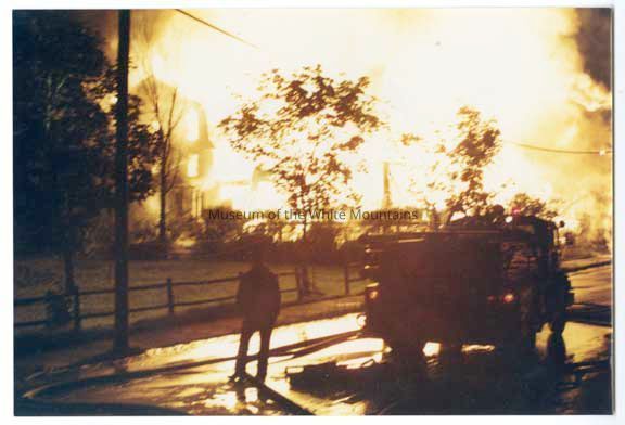 An onlooker stands beside a fire truck watching as the Mt. Aggasiz House is completely engulfed in flames.
