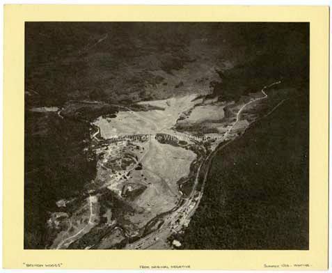Aerial view of Bretton Woods, including the Mount Washington Hotel. The photo was printed fom original negative that was part of a series on the White Mountains. Photographer "Hunting"?