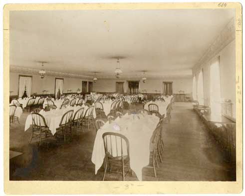 Interior view of the Mountain View House dining room. The room is very plain and decorated only with tables and chairs.