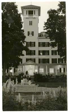 Exterior view of the tower of the Mountain View House. A group of male employees stand together on the front step.