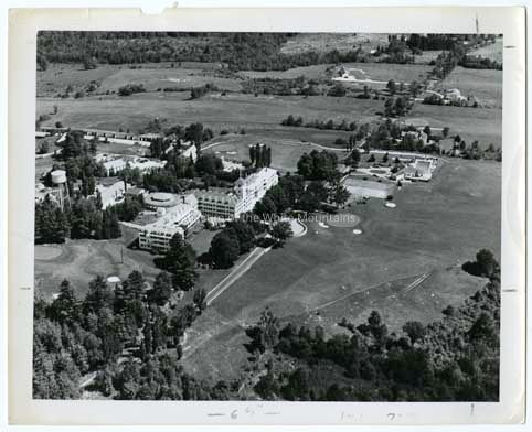 Aerial view of the Mountain View House. Includes the main hotel, outbuildings, barn, pool house, and water tower.