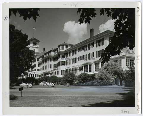 Exterior view of the Mountain View House, including the tower, porch, and lawn in front of the hotel.
