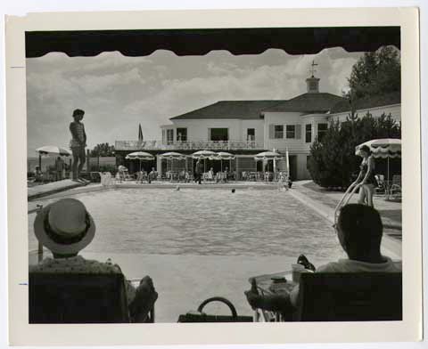 View of the pool at the Mountain View House. Guests sit in lounge chairs and a young girl is standing on the diving board.
