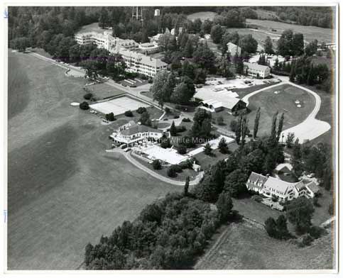 Aerial view of the Mountain View House. Includes the main hotel, outbuildings, barn, pool house, and water tower.