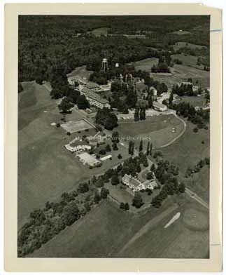 Aerial view of the Mountain View House. Includes the main hotel, outbuildings, barn, pool house, and water tower.