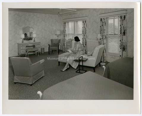 Interior view of one of the guest suites at the Mountain View House. A female guest sits and reads on the chair in her room.