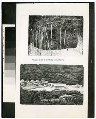 Scan of two photos from a photo album. The upper image is a postcard of the Madison Boulder in Madison, NH. The lower image is an aerial view of the New Profile House and cottages.
