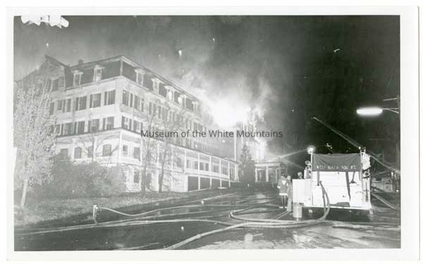 View of the Sinclair House as it burned to the ground in October 1978. A fire truck stands in front of the building and several fire fighters stand beside it.