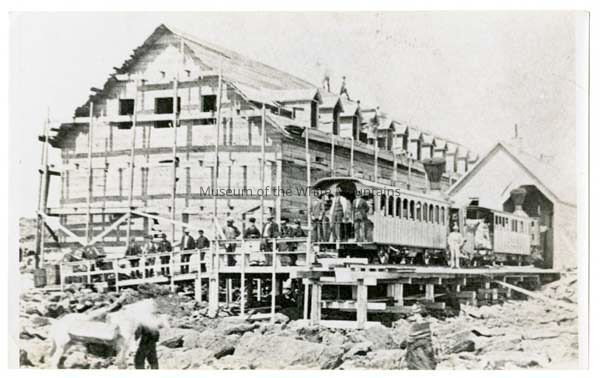 Exterior view of the Second Summit House while it was being constructed. The building is surrounded by scaffolding. Construction laborers are lined up along the Cog Railway platform and beside one of the locomotives. A man and horse and a woman stand in the foreground. Scanned from a stereograph.