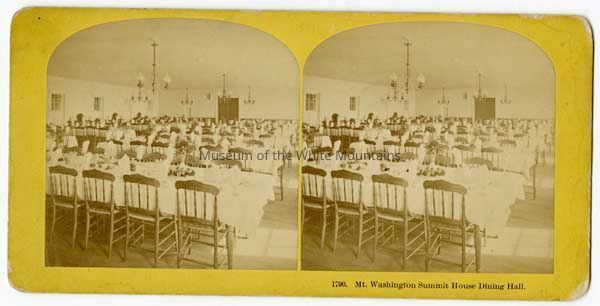 Interior view of the dining room at the Mount Washington Summit House. The tables are set for a meal.