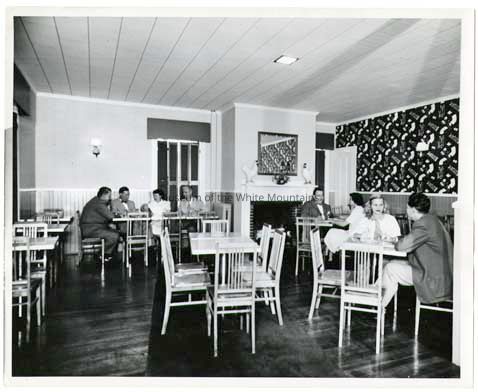 Interior view of the dining room at the Sunset Hill House. Several guests dine in the room, which is decorated with tables and chairs, as well a dark wallpaper on one wall.