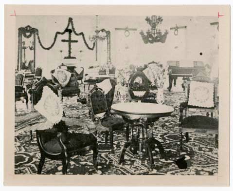 Interior view of the Twin Mountain House parlor, which is lavishly decorated with patterned carpet, chairs, tables, and garlands around the fireplace and mirrors.Acquisition