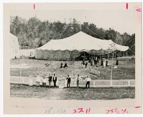 View of a tent set up on the lawn of the Twin Mountain House. A note on the back of the photo reads: "breeders' tent?"