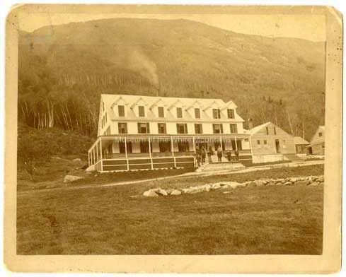 Exterior view of the two story addition with dormers attached to the original Willey farm house. Hand written on the verso: "Willey House new and old. Destroyed by fire."