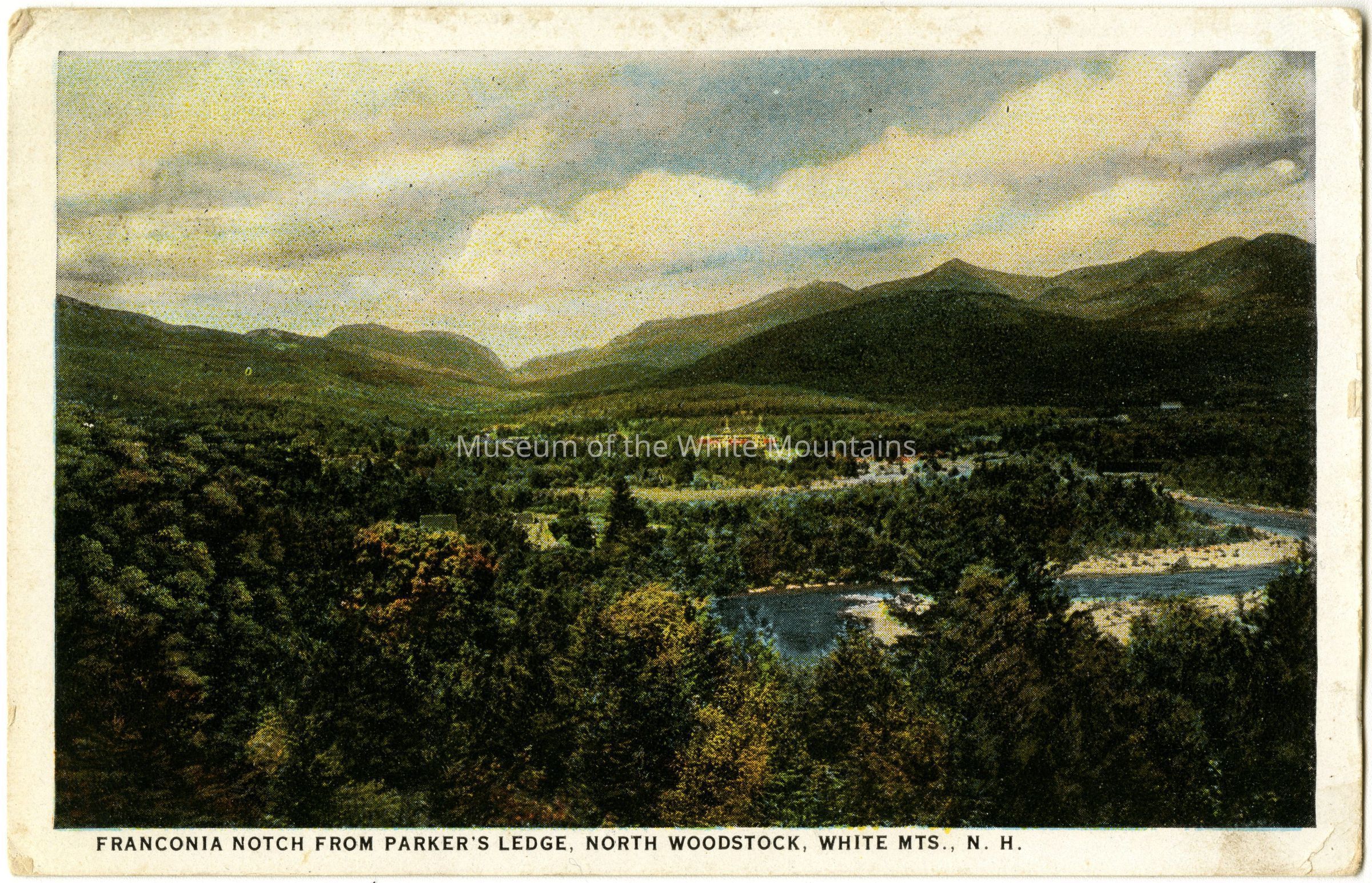 A postcard containing a landscape image of Franconia Notch from Parker's Ledge, North Woodstock, White Mountains, NH. The image is in color.