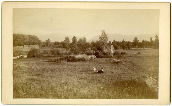 A boy and dog pose in a field. In the background are several buildings. The photo is undated, but was most likely taken in September 1887 during the family's trip to the White Mountains.