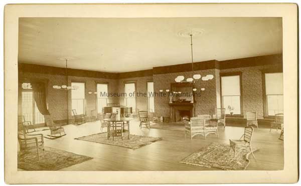 Interior view of the parlor at the Forest Hills Hotel. The room is large and sparsely furnished with rugs and chairs, and has a fireplace on one end. The photo is undated, but was most likely taken in September 1887 during the family's trip to the White Mountains.Acquisition