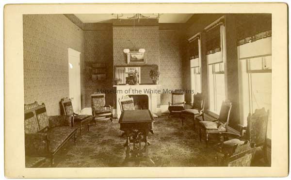 Interior view of a smaller parlor or reading room at the Forest Hills Hotel. The room is decorated with wallpaper, chairs in the Victorian style, and carpet. There is a fireplace at one end. The photo is undated, but was most likely taken in September 1887 during the family's trip to the White Mountains.Acquisition
