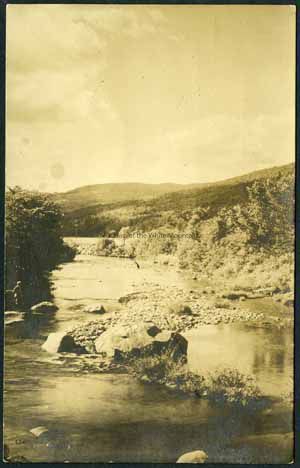 This is a postcard of a river view on the Ammonoosuc River. There are mountains in the background and some rocks in the river in the foreground.