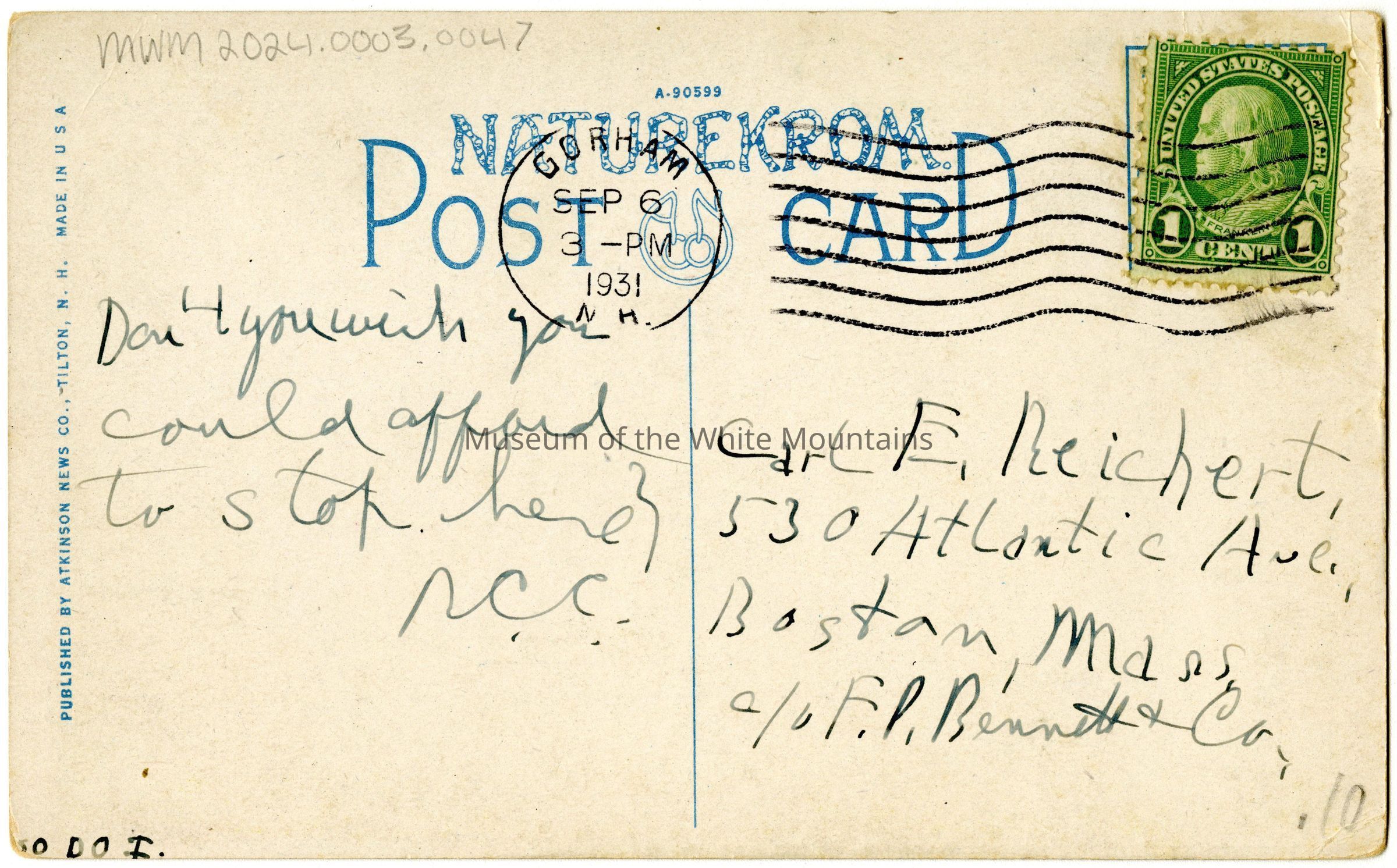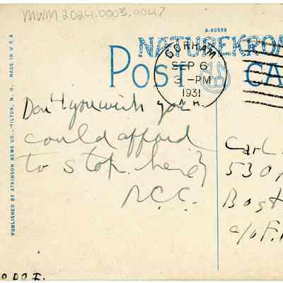 Divided postcard back. Postmarked from Gorham, NH on September 6, 1931 at 3pm.
