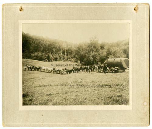 10 teams of horses pull a large metal cistern [water tank?] across a field to The Balsams hotel.