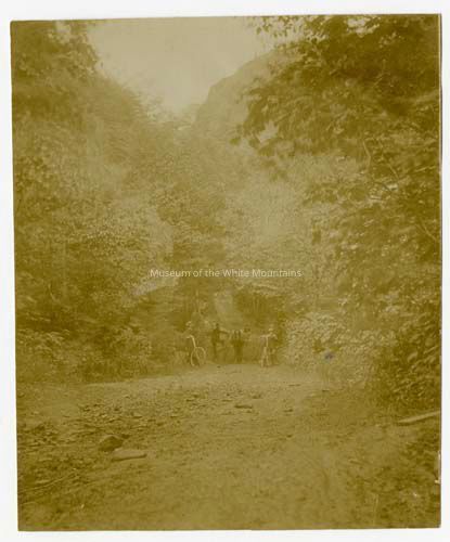 View of the early dirt road through Dixville Notch. A woman and boy stand in the road next to their bicycles; behind them, two figures pose in and beside a horse-drawn cart.