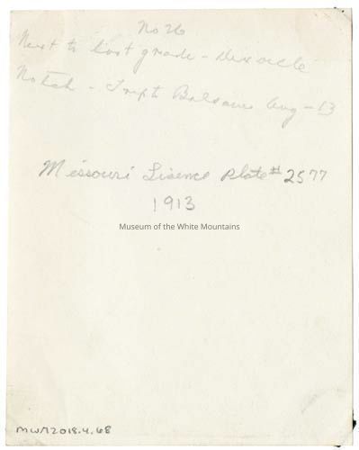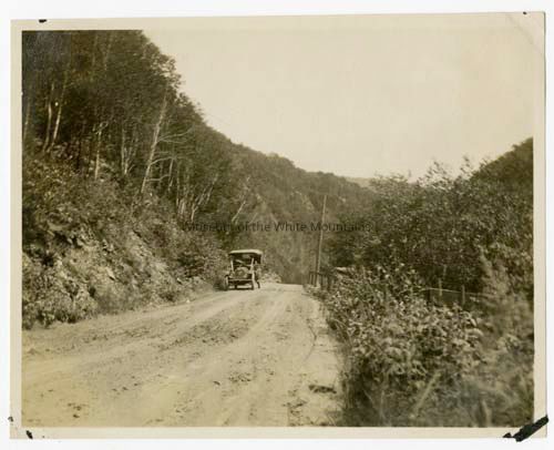 View of an automobile driving along the dirt road through Dixvlle Notch. Written in pencil on the verso: "Next to last grade - Dixville Notch, trip to Balsams - Aug 13." Below that is written: "Missouri license plate #2577, 1913."