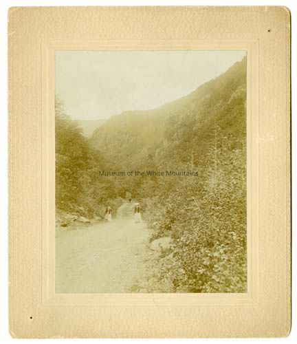 View of two women walking on the road through Dixville Notch. The women are dressed in skirts, shirtwaists, jackets, and hats and are holding wooden walking sticks. Behind them, a man is driving a horse and cart.