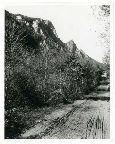 View of the dirt road through Dixville Notch, with Table Rock in the background. The road is rutted with vehicle tracks. Cira 1875.