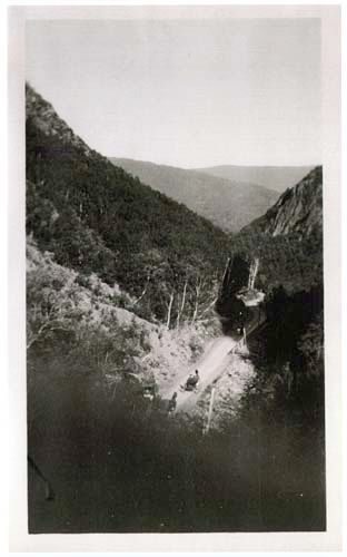 View looking down on several carriages/ wagons driving along the dirt road through Dixville Notch.