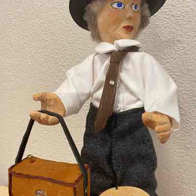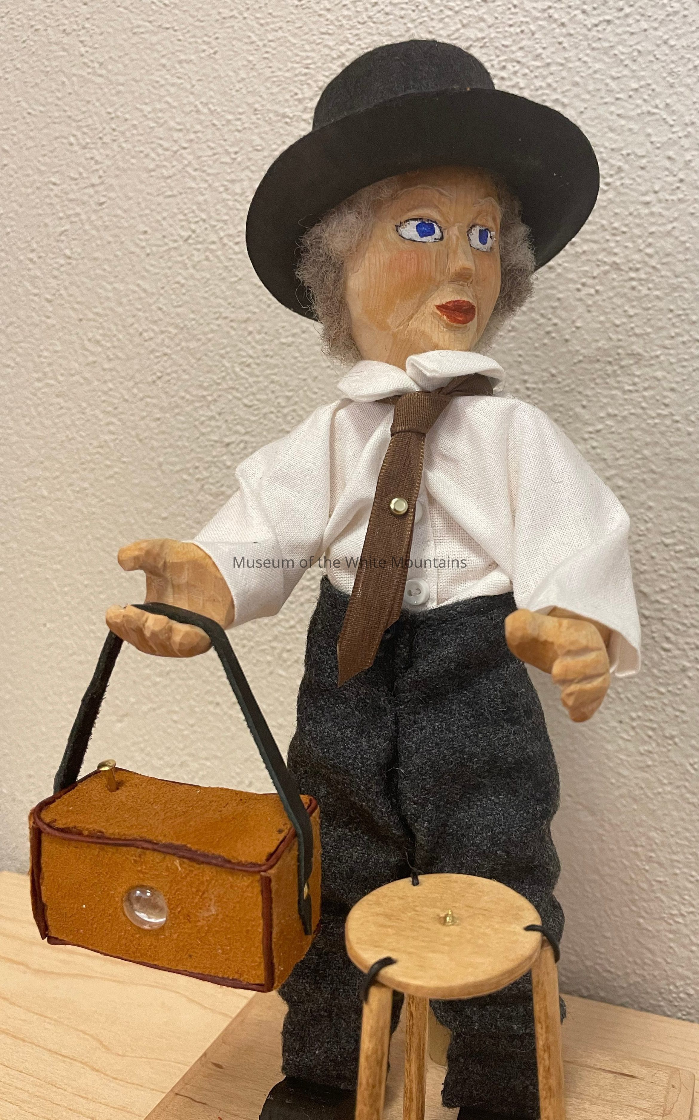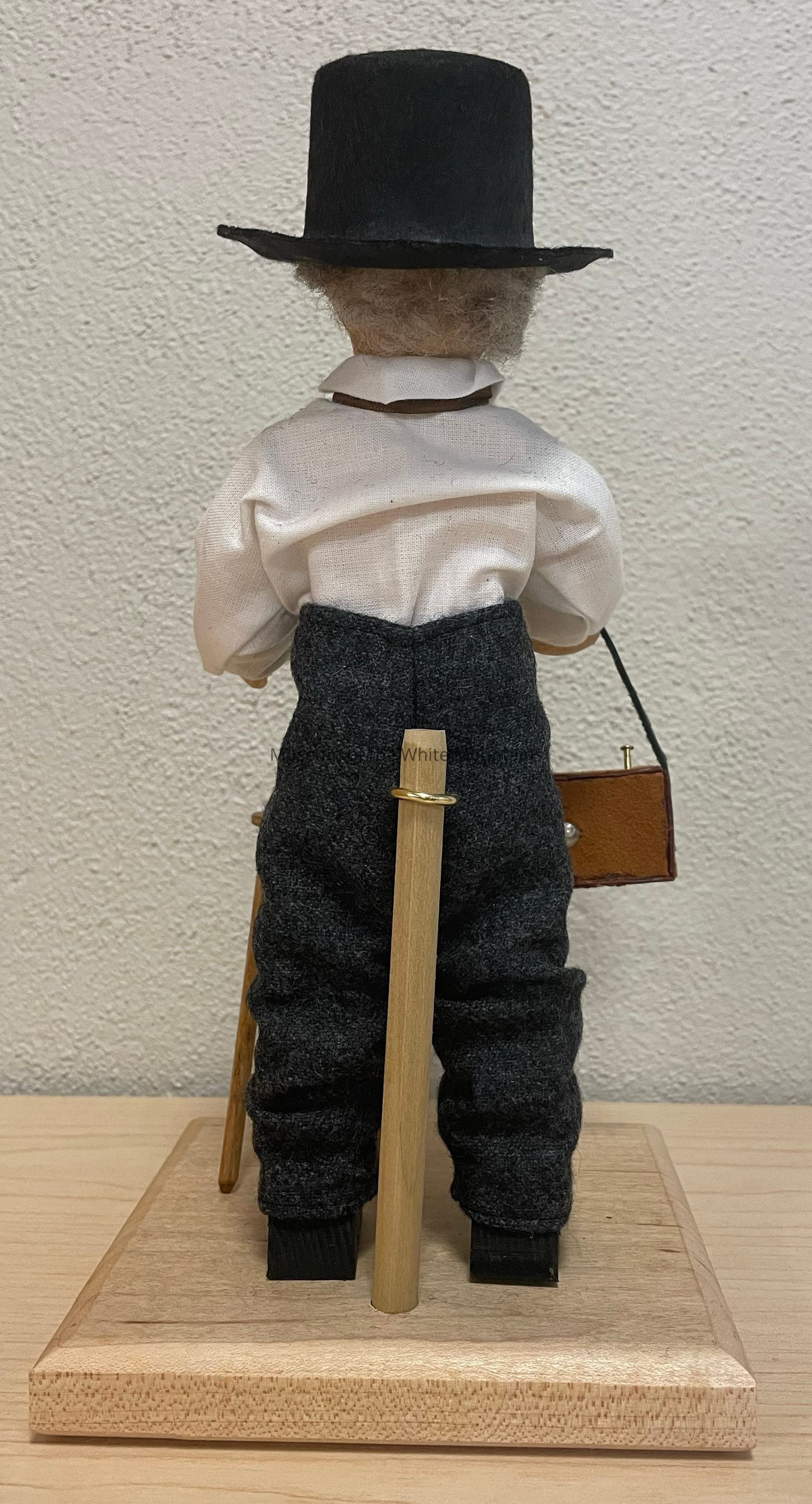 This object is a handcrafted doll designed to the likeness of Guy L. Shorey, made by traditional artist Sara Boothman Glines. The doll is part of a limited collection series #16, of their North Country Personalities-Hotel, Family & Farm Collection.