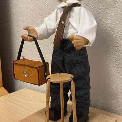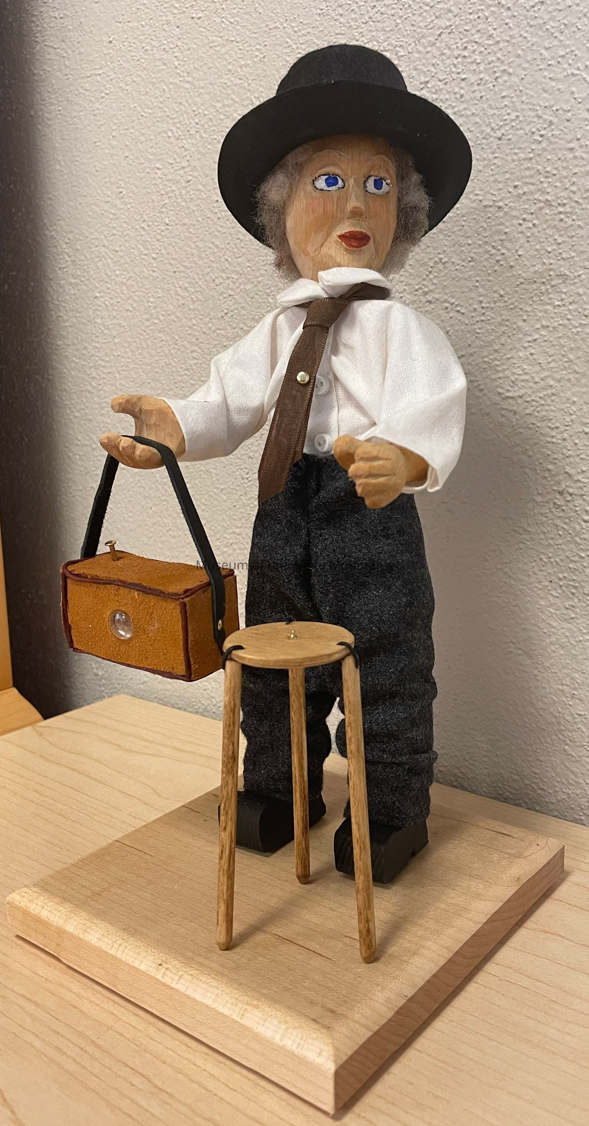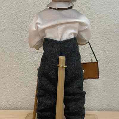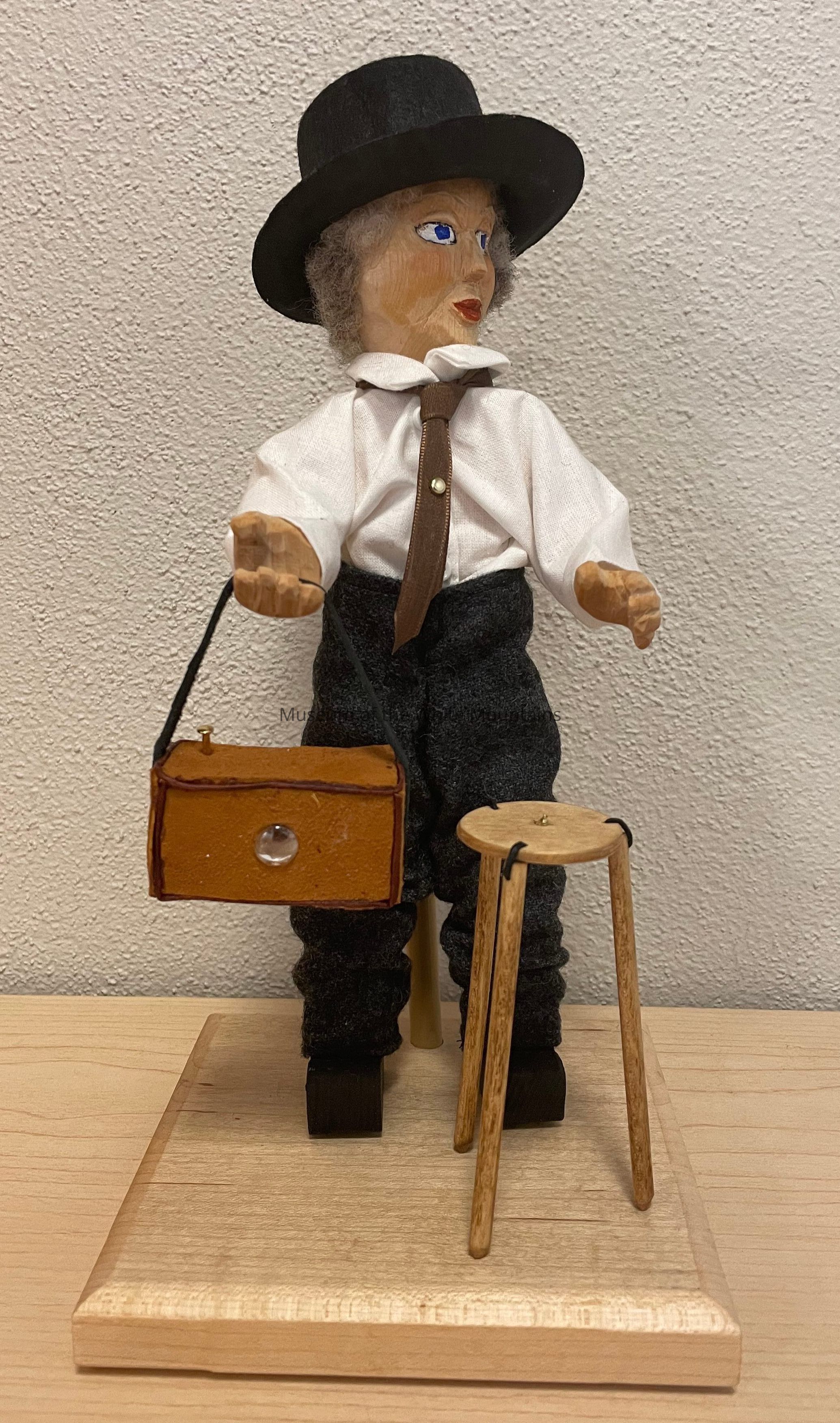 The doll is a carved wooden figurine dressed in a white cotton button down shirt adorned with a brown tie, and dark gray wool pants. His hair is a mixture of light gray and brown and made of a light yarn, with a black wide-rimmed hat. Crucially, he is holding his famous 11" by 17" camera, famously having weighed between 10-25 pounds, in his right hand. He is accompanied by a small, three-legged wooden stool. The doll is fully detachable from his wooden stand, held in place by a metal hook on the back of the object.