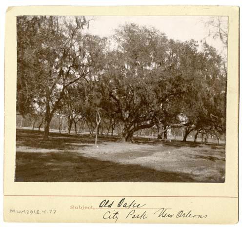 Two black and white photograhs pasted onto two sides of a piece of cardstock. On the bottom of the cardstock is printed "Subject" which has been filled in by the photographer. On the recto is "Cascades Dixville Notch". On the verso is "Old Oaks City Park New Orleans."