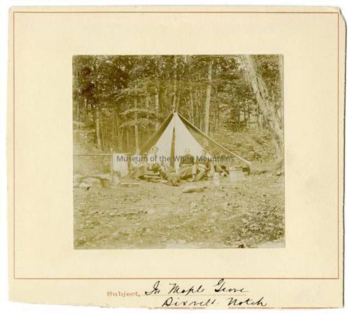 Two black and white photograhs pasted onto two sides of a piece of cardstock. On the bottom of the cardstock is printed "Subject" which has been filled in by the photographer. On the recto is "In Maple Glen Dixville Notch". On the verso is " Interior by Dr. Watkins [spelling?]"
