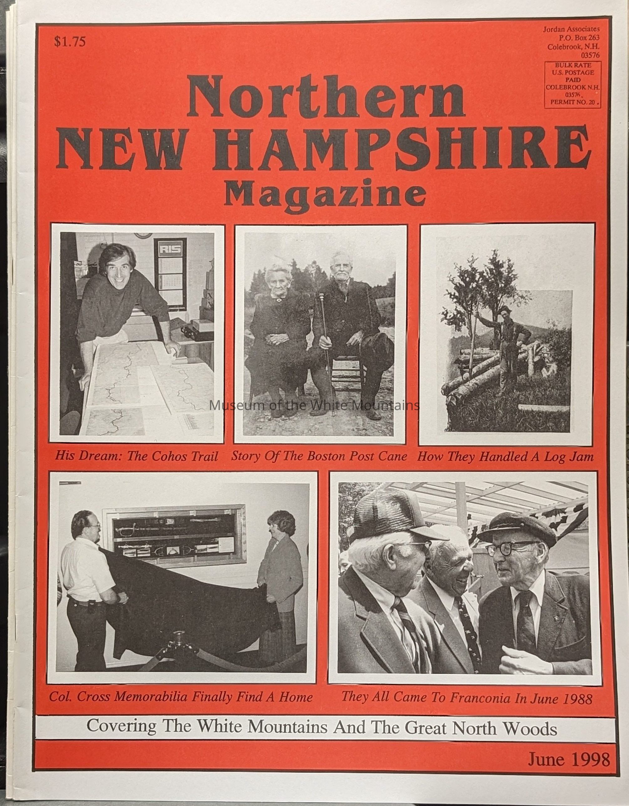 Written on front: Northern New Hampshire Magazine. [italicized] His Dream: The Cohos Trail, Story of the Boston Cane, How they Handled a Log Jam, Col. Cross Memorabilia Finally Find a Home, They All Came To Franconia In June 1988. Covering The White Mountains And The Great North Woods. June 1998. Written on back: Scheduled For Release This Summer, [italicized] Replace the Turf from Whence it was Hacked. A new book by Kathi L. McGraw. Middle Right [italicized] A reminiscence of Victorian Life and the beginning of Golf on the East Side of the White Hills. Soft cover book. On cover has title in the middle top followed below by five boxed pictures with headlines underneath them. Inside are several articles regarding the cultural events and activities in northern New Hampshire. On back below the advertisment for the golf book is subscription information. Back Description: Plain