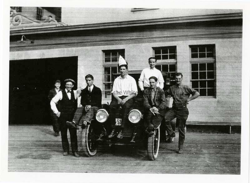 Photograph of Balsams Hotel male employees posing in front of a car.